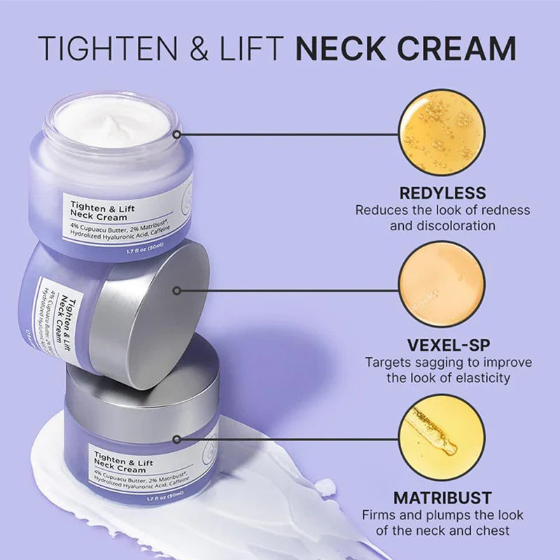 Our award winning tightening and lifting neck cream features a patented blend; specifically created to moisturise, firm and smooth the look of the delicate skin on your neck and chest.